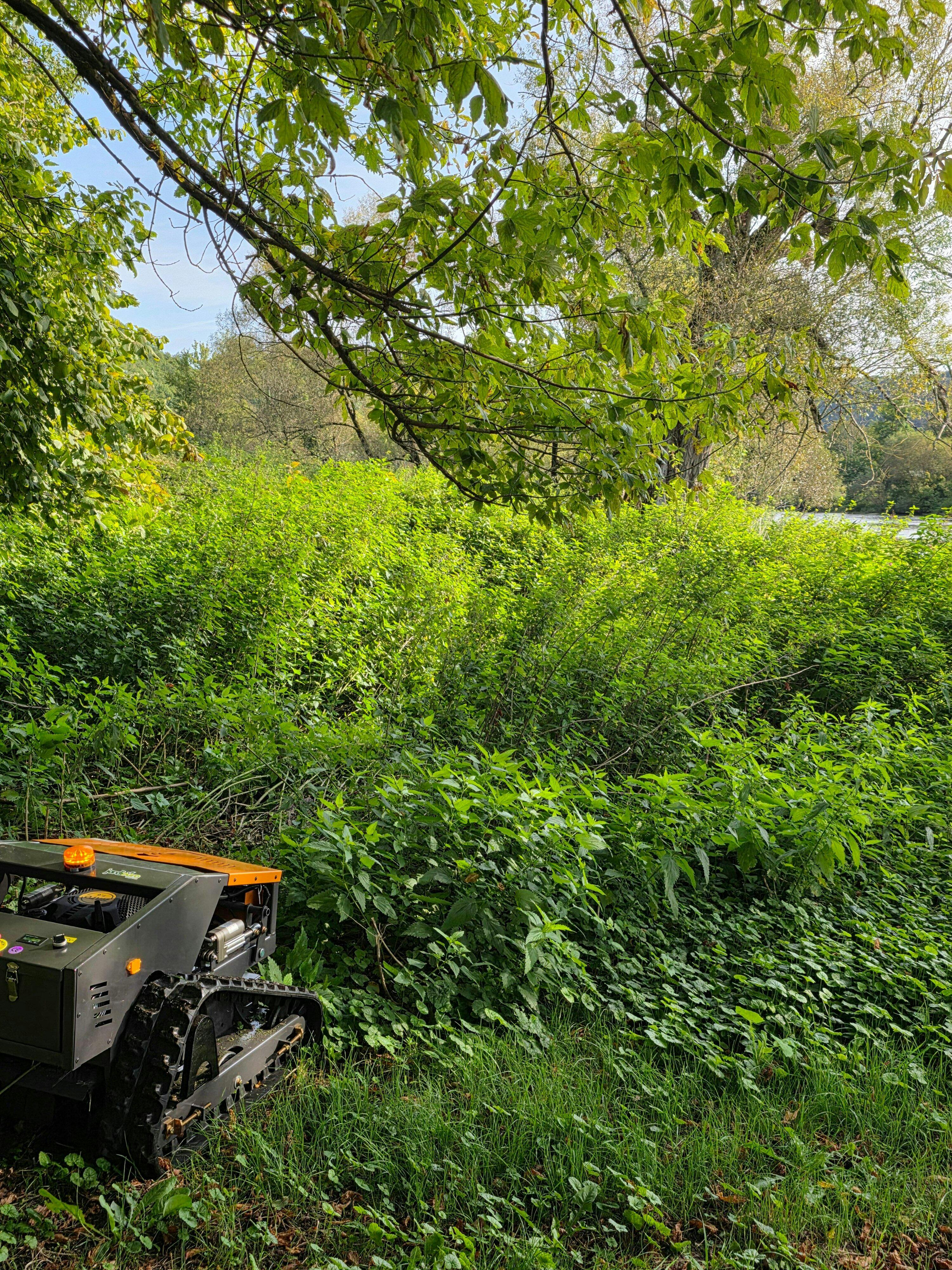 La tondeuse débroussailleuse télécommandée Rhino500 vous permet d'affronter les pentes jusqu'à 45° en toute sécurité, sans effort physique, tout en restant à distance.